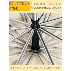 Прочная конструкция из стали и стекловолокна с 10 спицами обеспечивает устойчивость к ветровым нагрузкам. В сложенном виде зонт имеет компактные размеры, что делает его удобным для переноски и хранения.